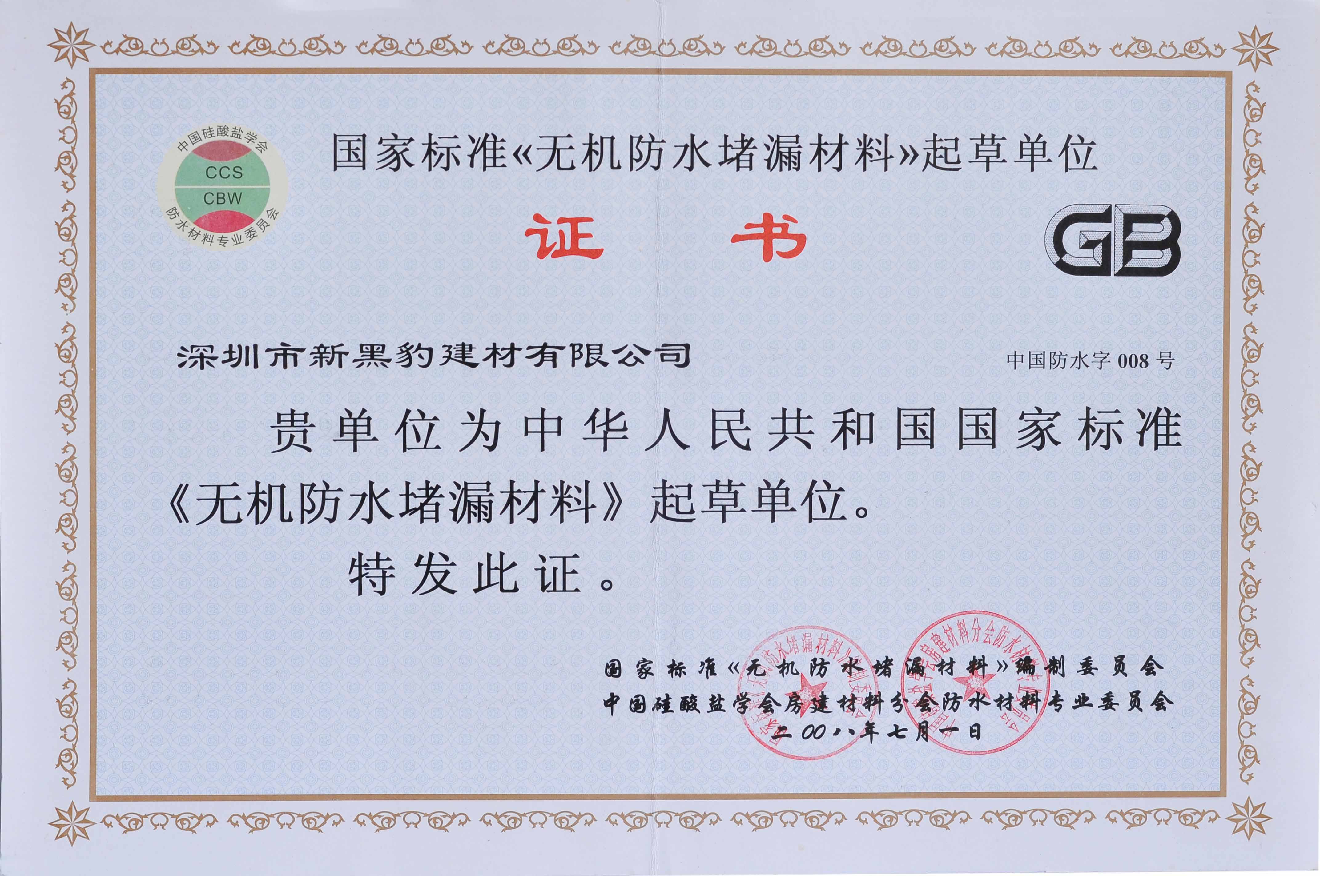 我公司2008年成為中華人民共和國國際標準《無機防水堵漏材料》起草單位證書