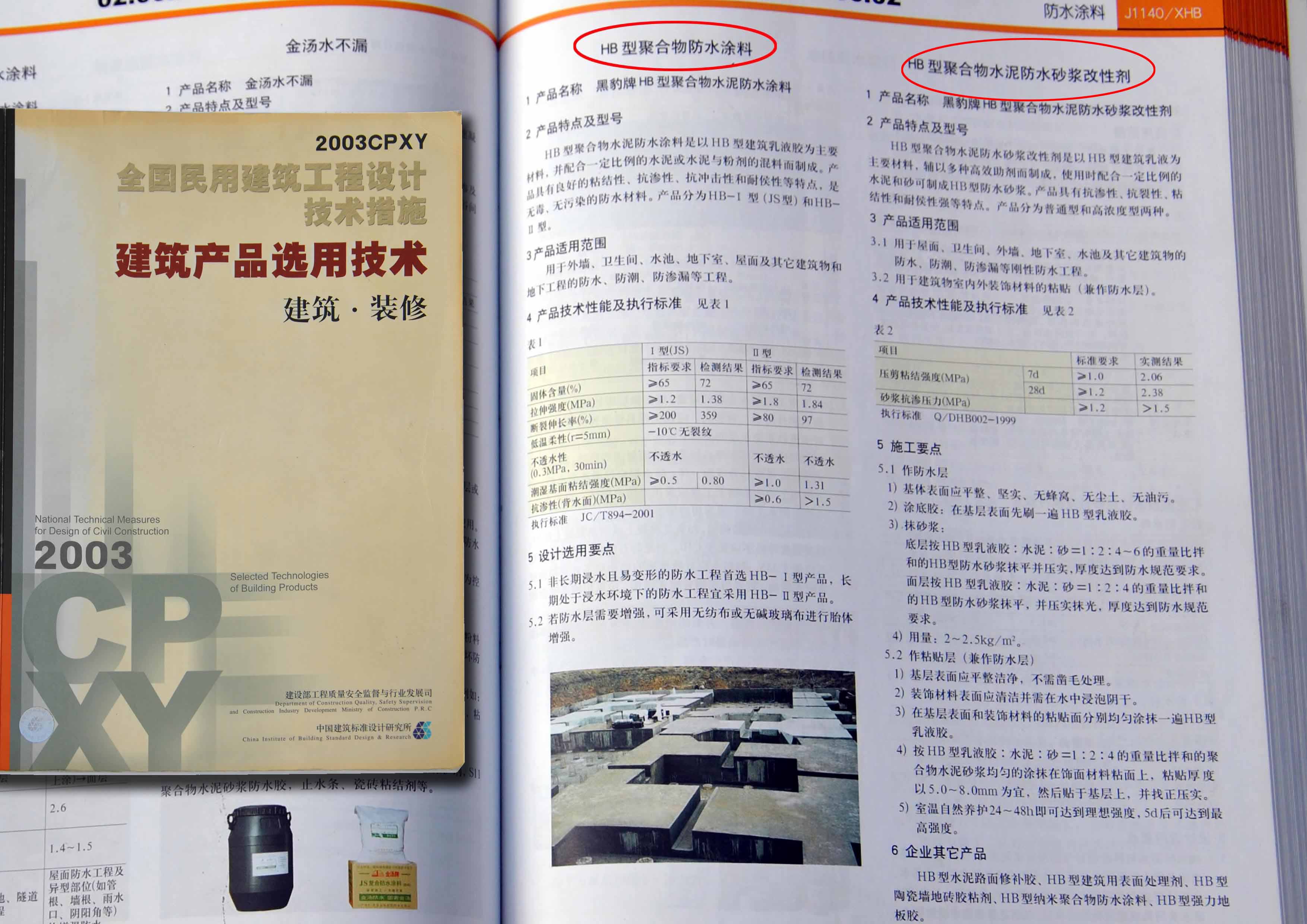 20031月出版的2003CPXY全國民用建筑工程設(shè)計技術(shù)措施 建筑產(chǎn)品選用技術(shù)(結(jié)構(gòu) 建筑 裝修)》闡述了各類產(chǎn)品的適用范圍,技術(shù)性能,選用要點以及技術(shù)經(jīng)濟分析等,用于指導(dǎo)如何正確選用建筑產(chǎn)品。該部分由國內(nèi)130余位專家編制,110余位專家審定。對64大類290余小類產(chǎn)品從技術(shù)及經(jīng)濟角度總體論述其選用要點,目的是解決怎么選產(chǎn)品的問題。我深圳市新黑豹建材有限公司的產(chǎn)品“HB型聚合物水泥防水涂料”和“聚合物水泥防水砂漿改性劑”收編在內(nèi)。