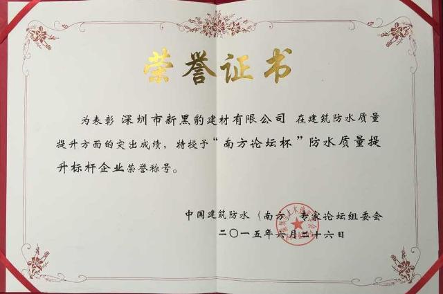 2015年6月27日,“第四屆建筑防水(南方)專家論壇”在深圳市五洲賓館召開。本次論壇由中國(guó)建筑防水協(xié)會(huì)、中國(guó)建筑防水專家委員會(huì)主辦。在本次會(huì)議中,我公司被授予“南方論壇杯”防水質(zhì)量提升標(biāo)桿企業(yè)。
