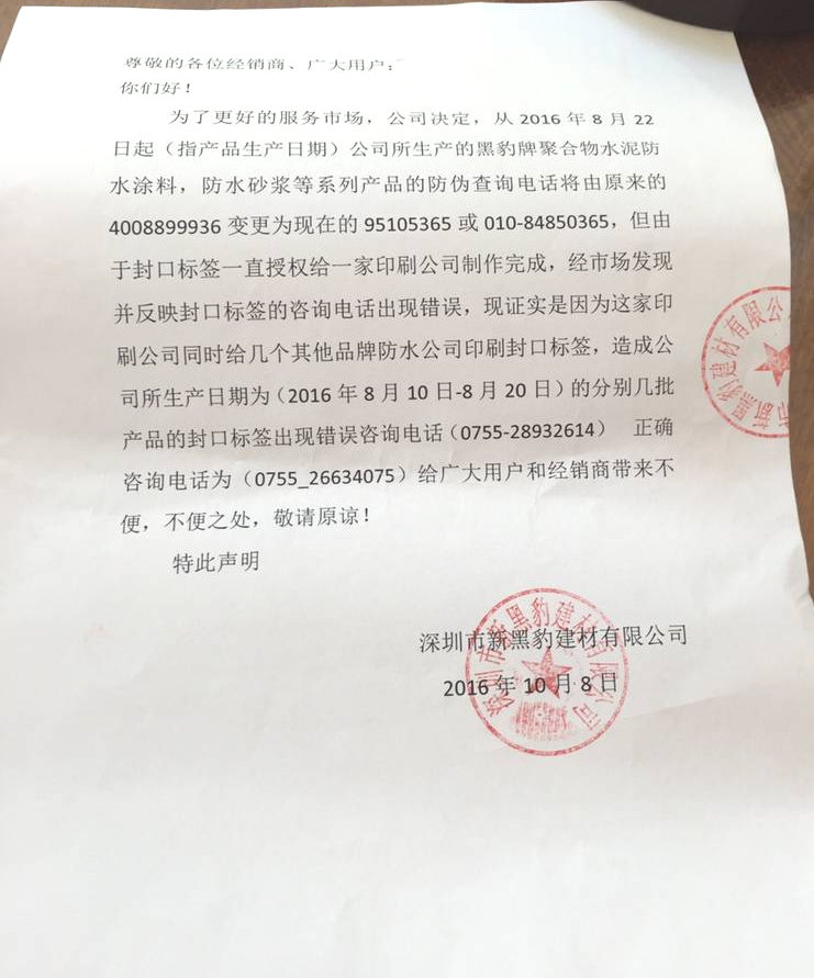 您們好,最近,有一些不法分子,假借我公司名譽(yù)私刻我公司公章,在社會(huì)上散發(fā)更改防偽查詢電話說明的文件(如下圖),說:“反映封口標(biāo)簽的咨詢電話出現(xiàn)錯(cuò)誤”、“是印刷公司同時(shí)給幾個(gè)其他品牌防水公司印刷封口標(biāo)簽”所致,這簡(jiǎn)直是一派胡言,我新黑豹建材有限公司,從來就沒有出現(xiàn)過這件事,沒有更換過封口條。我們只更換過防偽驗(yàn)證碼,在更換時(shí),工作非常仔細(xì)、非常嚴(yán)謹(jǐn),都是提前一個(gè)多月告訴消費(fèi)者。因此請(qǐng)廣大客戶千萬別上當(dāng),同時(shí),我們也會(huì)保留對(duì)不法分子追究法律責(zé)任的權(quán)利。