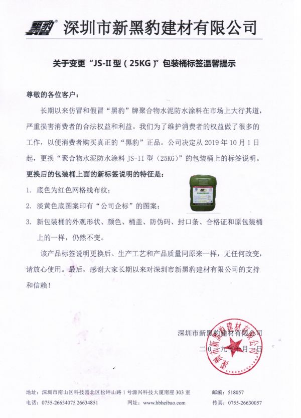 | 尊敬的各位客戶: 長期以來假冒和仿冒“黑豹”牌聚合物水泥防水涂料在市場上大行其道,嚴(yán)重?fù)p害消費(fèi)者的合法權(quán)益和利益。我們?yōu)榱司S護(hù)消費(fèi)者的權(quán)益做了很多的工作,以便消費(fèi)者購買真正的“黑豹”正品。公司決定從2019年10月1日起,更換“聚合物水泥防水涂料JS-II型(25KG)”的包裝桶上的標(biāo)簽說明。 更換后的包裝桶上面的新標(biāo)簽說明的特征是: 1.底色為紅色網(wǎng)格線布紋; 2.淡黃色底圖案印有“公司企標(biāo)”的圖案; 3.新包裝桶的外觀形狀、顏色、桶蓋、防偽碼、封口條、合格證和原包裝桶上的一樣,仍然不變。 該產(chǎn)品標(biāo)簽說明更換后、生產(chǎn)工藝和產(chǎn)品質(zhì)量同原來一樣,無任何改變。請放心使用。最后,感謝大家長期以來對深圳市新黑豹建材有限公司的支持和信賴!