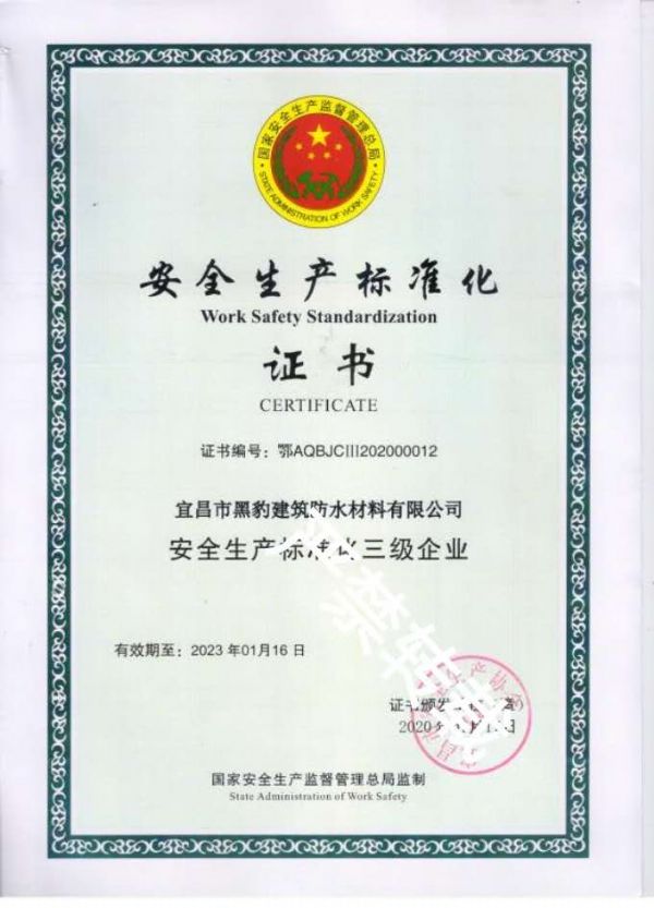 正當(dāng)人們手捧豐收碩果送走了2019年;正當(dāng)人們滿懷豪情闊步邁進(jìn)2020年;正當(dāng)人們在黨中央英明領(lǐng)導(dǎo)下,團(tuán)結(jié)一心眾志成城戰(zhàn)勝瘟疫,取得了決定性的勝利;正當(dāng)東西南北中各條戰(zhàn)線各族人民信心百倍斗志昂揚(yáng),按照要求分批次有步驟地復(fù)工復(fù)產(chǎn);就在春風(fēng)楊柳萬千條,億萬人民盡舜堯 ,紅雨隨心翻作浪,青山著意化為橋,山花爛漫迎春天的時(shí)節(jié),深圳市新黑豹建材有限公司宜昌生產(chǎn)基地------宜昌市黑豹建筑防水材料有限公司傳來喜訊,企業(yè)安全生產(chǎn)標(biāo)準(zhǔn)化已驗(yàn)收達(dá)標(biāo),并榮獲國家安全生產(chǎn)監(jiān)督管理總局證書。