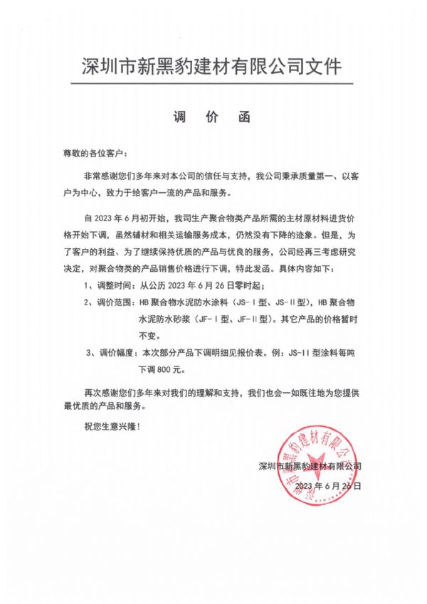 尊敬的各位客戶: 非常感謝您們多年來對本公司的信任與支持,我公司秉承質(zhì)量第一、以客戶為中心,致力于給客戶一流的產(chǎn)品和服務(wù)。 自2023年6月初開始,我司生產(chǎn)聚合物類產(chǎn)品所需的主材原材料進(jìn)貨價(jià)格開始下調(diào),雖然輔材和相關(guān)運(yùn)輸服務(wù)成本,仍然沒有下降的跡象。但是,為了客戶的利益、為了繼續(xù)保持優(yōu)質(zhì)的產(chǎn)品與優(yōu)良的服務(wù),公司經(jīng)再三考慮研究決定,對聚合物類的產(chǎn)品銷售價(jià)格進(jìn)行下調(diào),特此發(fā)函。具體內(nèi)容如下: 1、調(diào)整時(shí)間:從公歷2023年6月26日零時(shí)起; 2、調(diào)價(jià)范圍:HB聚合物水泥防水涂料(JS-Ⅰ型、JS-Ⅱ型),HB聚合物水泥防水砂漿(JF-Ⅰ型、JF-Ⅱ型)。其它產(chǎn)品的價(jià)格暫時(shí)不變。 3、調(diào)價(jià)幅度:本次部分產(chǎn)品下調(diào)明細(xì)見報(bào)價(jià)表。例:JS-II型涂料每噸下調(diào)800元。 再次感謝您們多年來對我們的理解和支持,我們也會(huì)一如既往地為您提供最優(yōu)質(zhì)的產(chǎn)品和服務(wù)。 祝您生意興??! 深圳市新黑豹建材有限公司 2023年6月25日